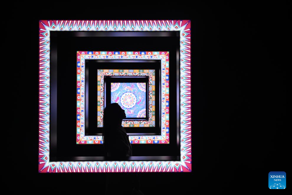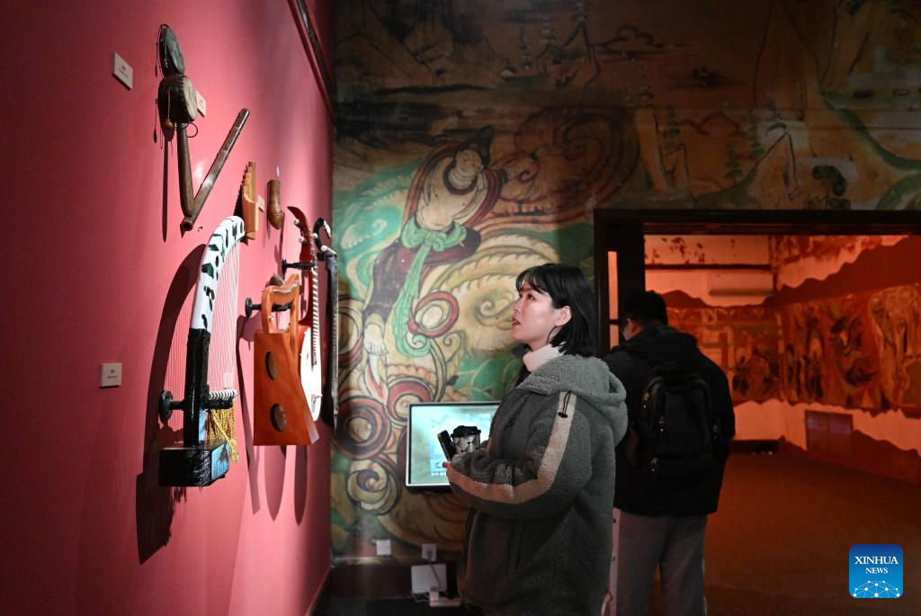 A visitor views exhibits at an exhibition themed on Dunhuang culture at the Tianjin Digital Art Museum in Tianjin, north China, Nov. 28, 2023. The exhibition will last until March 2024. (Xinhua/Sun Fanyue)