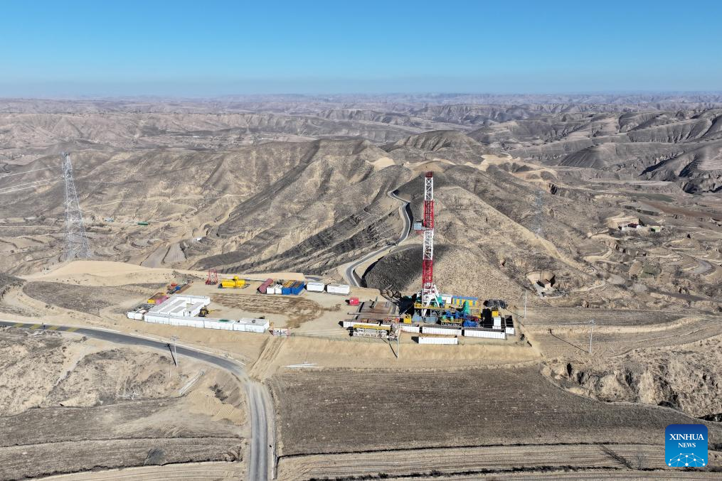 This aerial photo taken on Nov. 30, 2023 shows a drilling site of Hongde oilfield in Huanxian County of northwest China's Gansu Province. Changqing Oilfield, a branch of PetroChina, has discovered a large-scale, well-preserved oilfield with geological reserves of over 100 million tonnes in the county. (Changqing Oilfield/Handout via Xinhua)