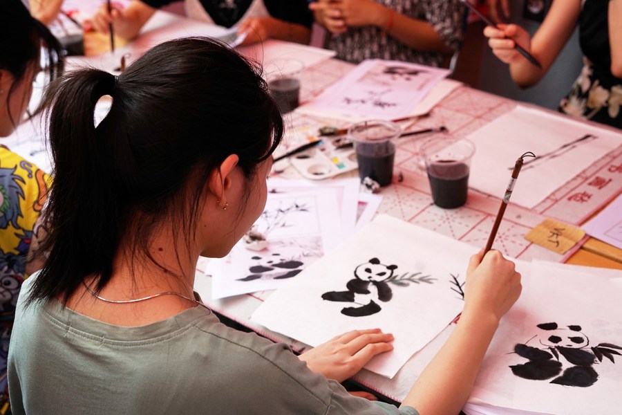 A Vietnamese student works on a Chinese painting during an event celebrating the 14th annual United Nations Chinese Language Day at Hanoi University in Vietnam, April 21, 2023. (Xinhua/Hu Jiali)