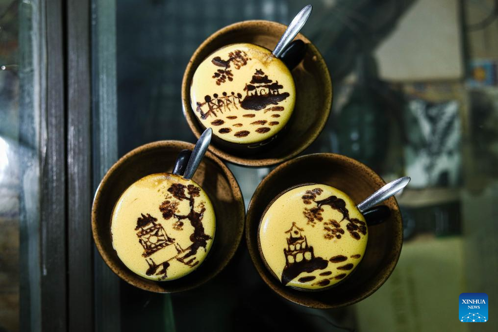 This photo taken on July 22, 2023 shows egg coffee with patterns of Hanoi's landscape at a coffee shop in the Old Quarter in Hanoi, capital of Vietnam.?(Photo by Pham Dinh Duc/Xinhua)