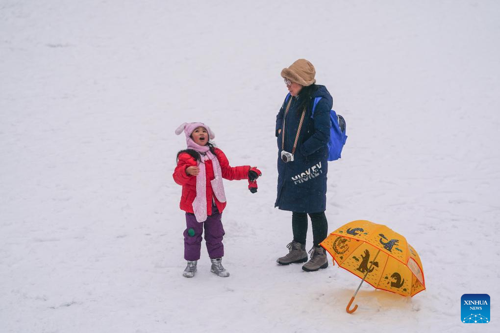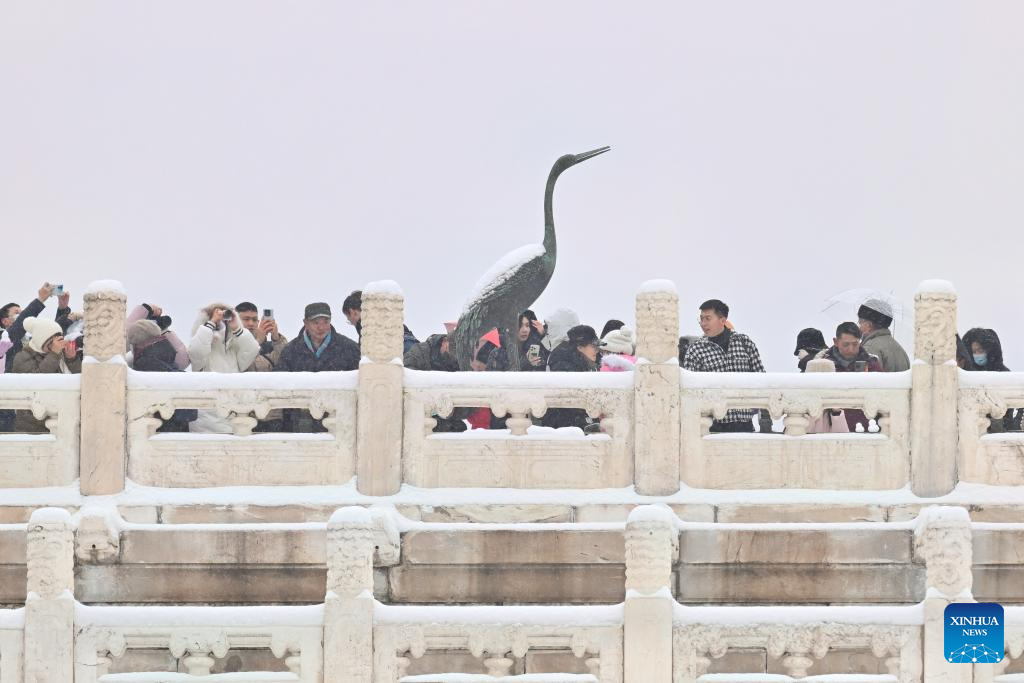 This photo taken by a mobile phone shows tourists visiting the Palace Museum in snow in Beijing, capital of China, Dec. 13, 2023. China's meteorological authority on Wednesday renewed a yellow alert for blizzards, forecasting intense snowfall in the north of the country. (Xinhua/Zhang Chuanqi)