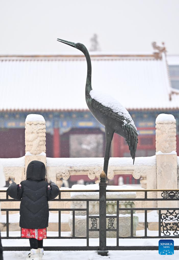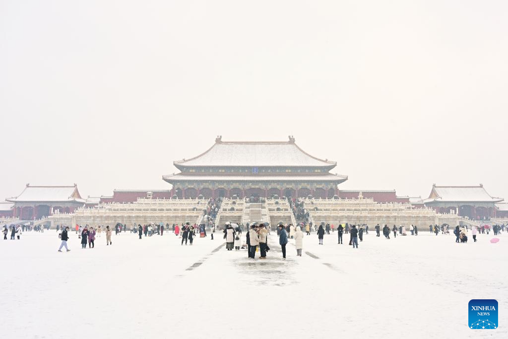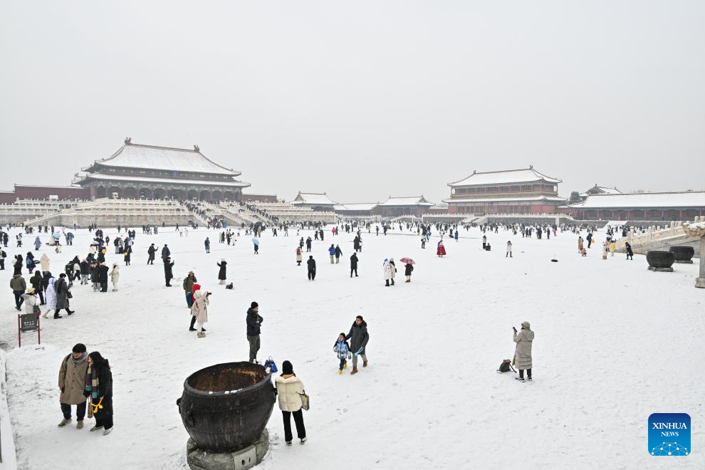 Tourists visit the Palace Museum in snow in Beijing, capital of China, Dec. 13, 2023. China's meteorological authority on Wednesday renewed a yellow alert for blizzards, forecasting intense snowfall in the north of the country. (Xinhua/Li Xin)