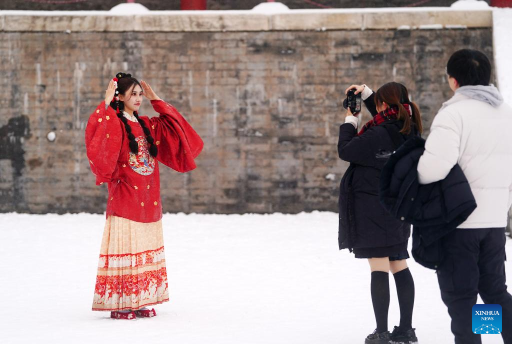 A tourist poses for a photo in snow at the Palace Museum in Beijing, capital of China, Dec. 13, 2023. China's meteorological authority on Wednesday renewed a yellow alert for blizzards, forecasting intense snowfall in the north of the country. (Xinhua/Chen Yehua)