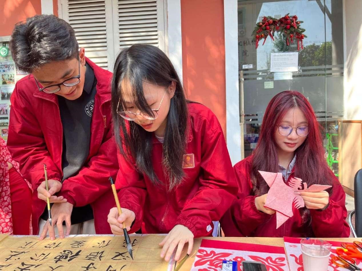 Students try Chinese calligraphy and paper cutting during a cultural activity hosted by the Confucius Institute at Hanoi University, Dec. 8. (People's Daily/Zhang Yuannan)