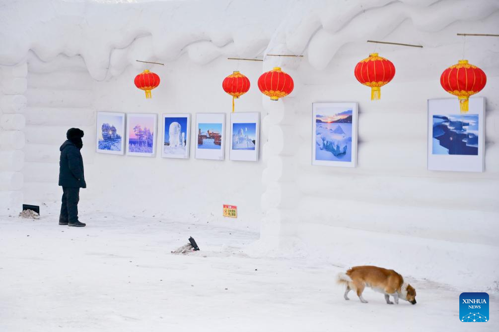A visitor visits a photography exhibition at a square in Beiji Village of Mohe, northeast China's Heilongjiang Province, Dec. 22, 2023. Known as China's "North Pole," Mohe has developed a variety of winter tourism programs in recent years, attracting tourists to experience an "extremely cold journey." (Xinhua/Shi Feng)