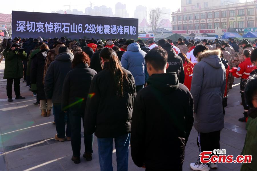 People pay a silent tribute during a mourning ceremony for earthquake victims at Dahejia Township of Jishishan County, northwest China's Gansu Province, Dec. 25, 2023. (Photo/China News Service)