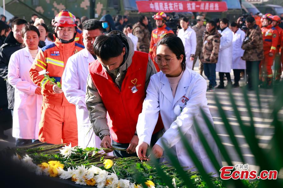 People lay flowers to mourn earthquake victims during a mourning ceremony for earthquake victims at Dahejia Township of Jishishan County, northwest China's Gansu Province, Dec. 25, 2023. (Photo/China News Service)