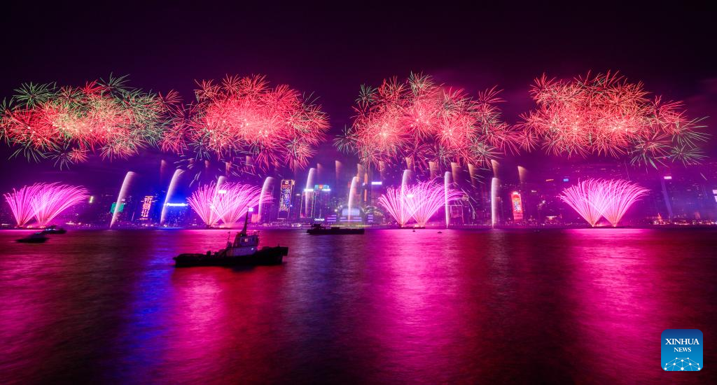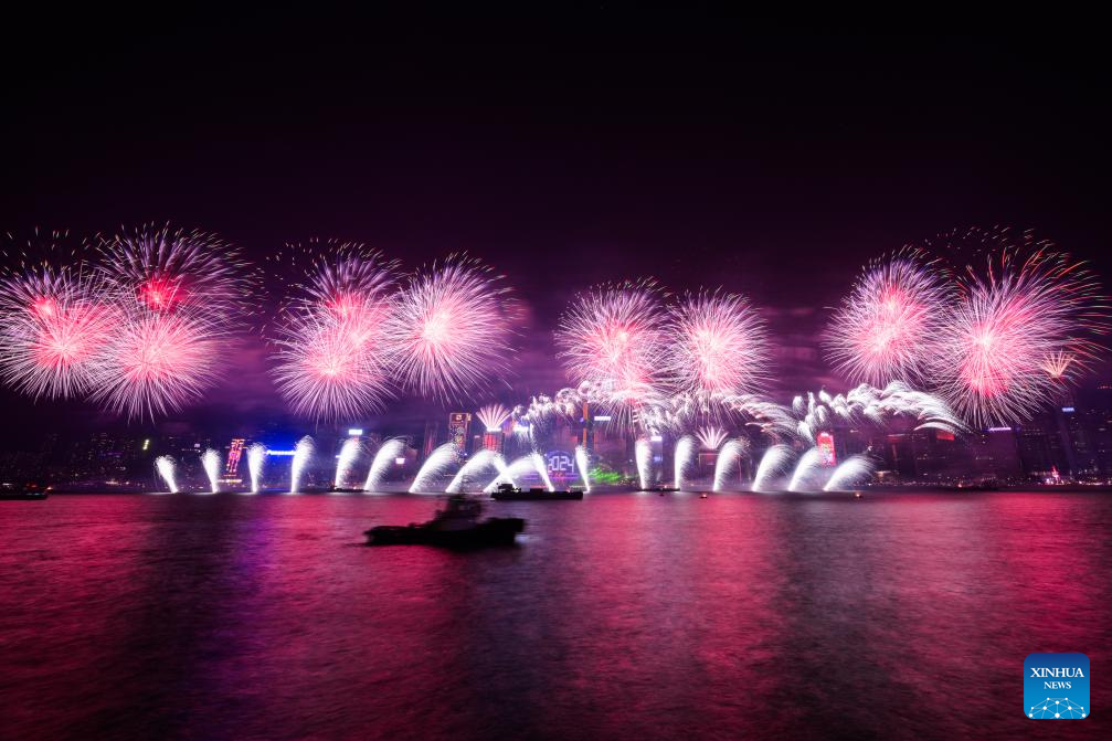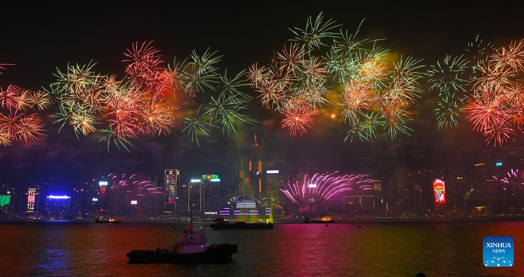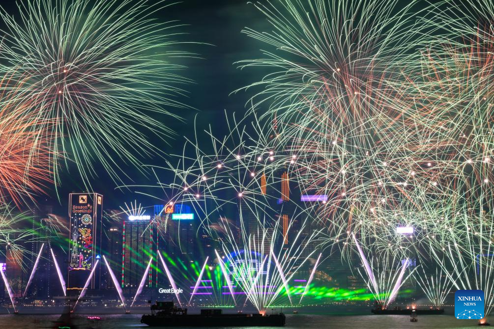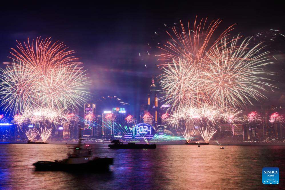 Fireworks in celebration of the New Year illuminate the sky over Victoria Harbour in Hong Kong, south China, Jan. 1, 2024. (Xinhua/Chen Duo)