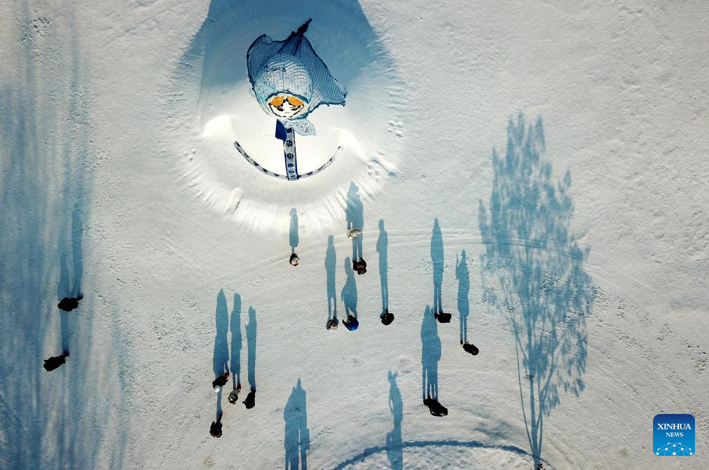 This aerial photo taken on Jan. 7, 2024 shows people visiting the Volga Manor in Harbin, northeast China's Heilongjiang Province. The Volga Manor, a Russian culture-themed park, turned into a world of ice and snow during the winter time, attracting lots of visitors. (Xinhua/Wang Jianwei)