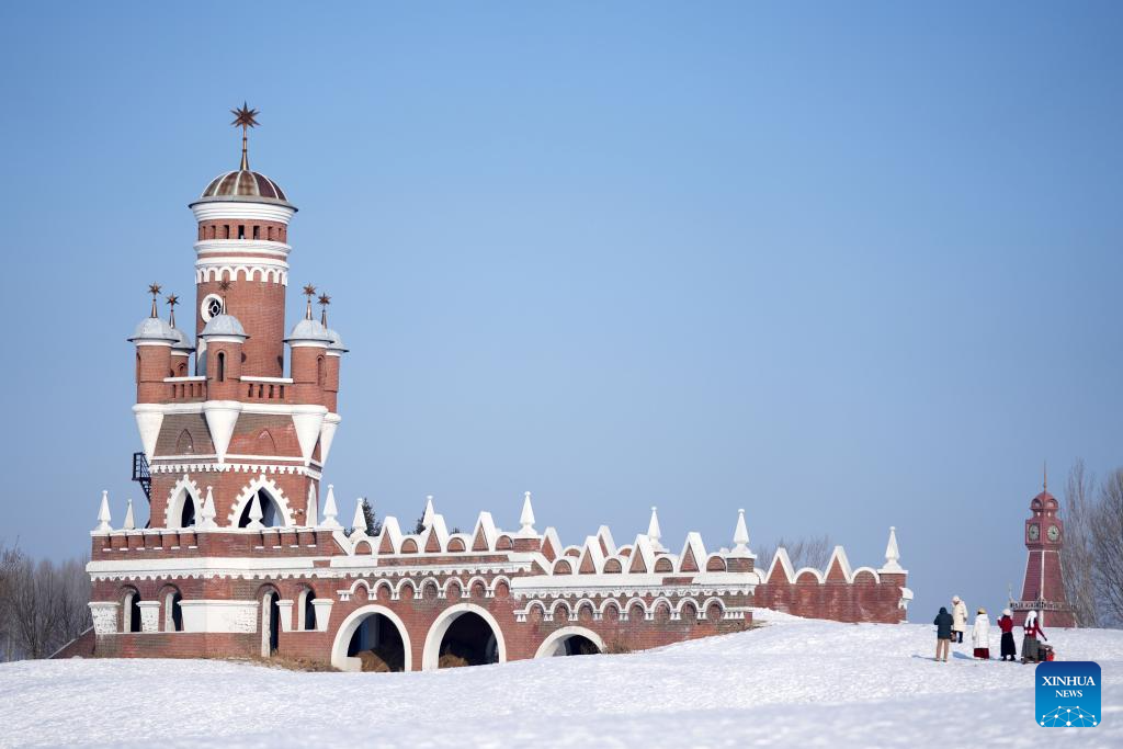 People enjoy themselves at the Volga Manor in Harbin, northeast China's Heilongjiang Province, Jan. 7, 2024. The Volga Manor, a Russian culture-themed park, turned into a world of ice and snow during the winter time, attracting lots of visitors. (Xinhua/Wang Jianwei)