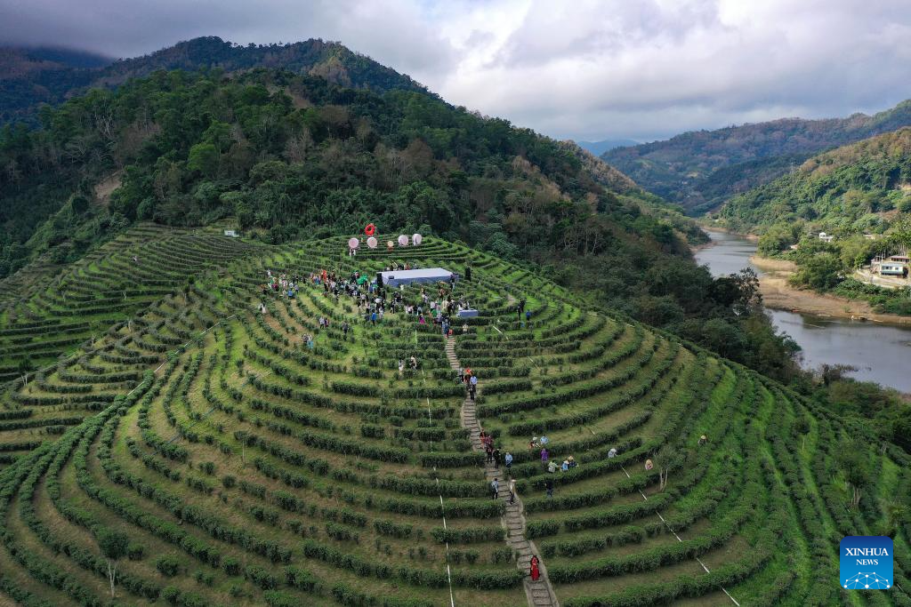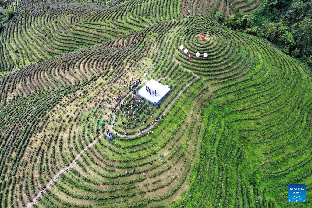 An aerial drone photo taken on Jan. 11, 2024 shows a tea garden in Wuzhishan, south China's Hainan Province. Harvest period for the early spring tea has arrived in Wuzhishan of Hainan Province. (Xinhua/Guo Cheng)
