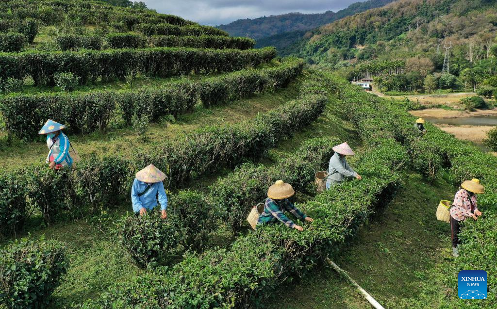 Farmers collect tea leaves at a tea garden in Wuzhishan, south China's Hainan Province, Jan. 11, 2024. Harvest period for the early spring tea has arrived in Wuzhishan of Hainan Province. (Xinhua/Guo Cheng)