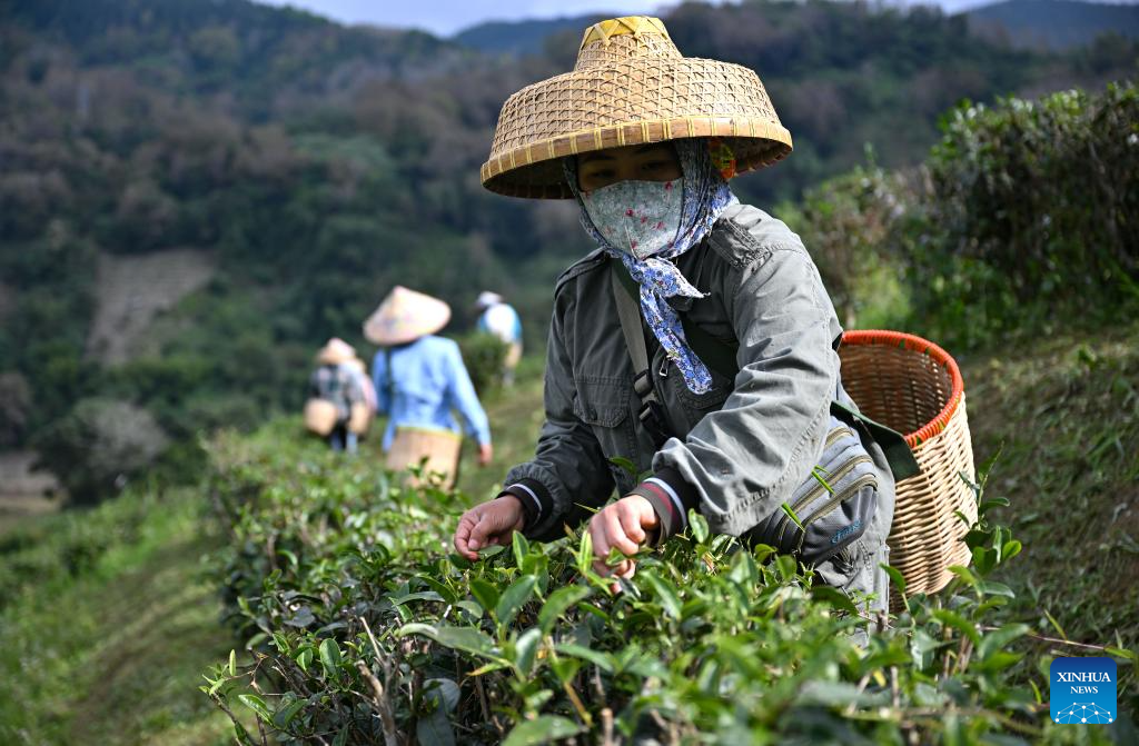 A farmer collects tea leaves at a tea garden in Wuzhishan, south China's Hainan Province, Jan. 11, 2024. Harvest period for the early spring tea has arrived in Wuzhishan of Hainan Province. (Xinhua/Guo Cheng)