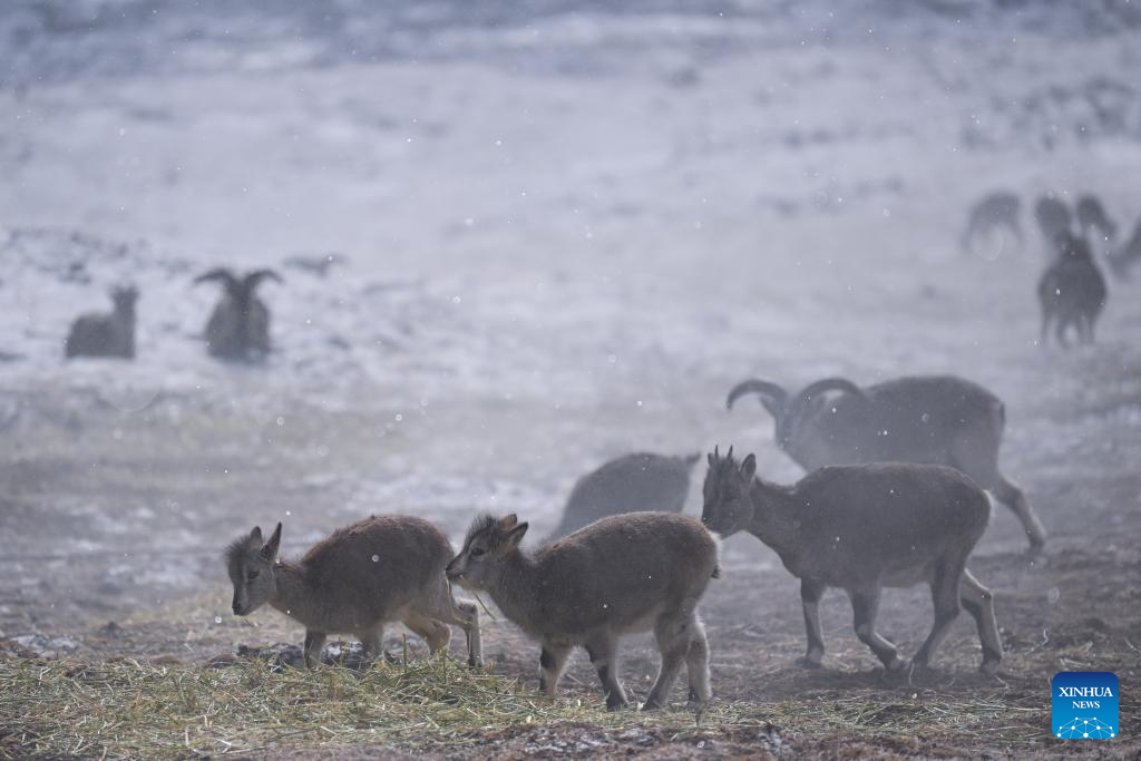 Blue sheep are pictured on Mt. Gangshika in Menyuan Hui Autonomous County, northwest China's Qinghai Province, Jan. 23, 2024. (Xinhua/Zhang Long)