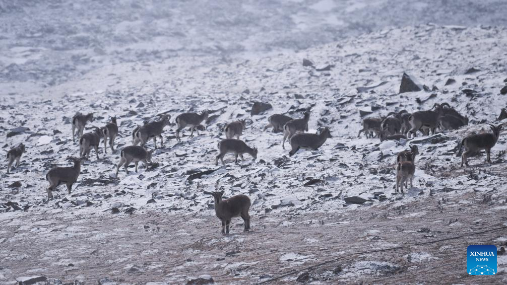 Blue sheep are pictured on Mt. Gangshika in Menyuan Hui Autonomous County, northwest China's Qinghai Province, Jan. 23, 2024. (Xinhua/Geng Huihuang)