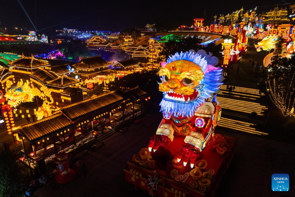 A drone photo taken on Jan. 26, 2024 shows light installations for an upcoming lantern show in Zigong, southwest China's Sichuan Province. The city of Zigong is well known for the large number of dinosaur fossils that have been unearthed in past decades. (Xinhua/Shen Bohan)
