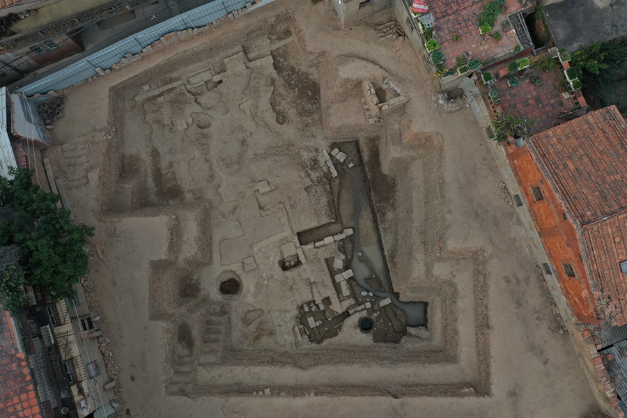 Photo shows a bird's-eye view of part of the archaeological excavation site of the Site of Maritime Trade Office in Quanzhou, southeast China's Fujian Province. (Photo/Wang Jun)