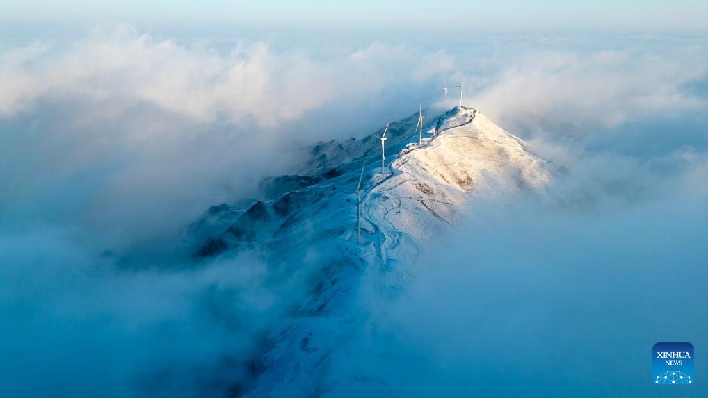 This aerial drone photo taken on Jan. 29, 2024 shows the scenery after snow at Dajiucaiping scenic area in Hezhang County of Bijie, southwest China's Guizhou Province. (Photo by Chen Chunzhi/Xinhua)