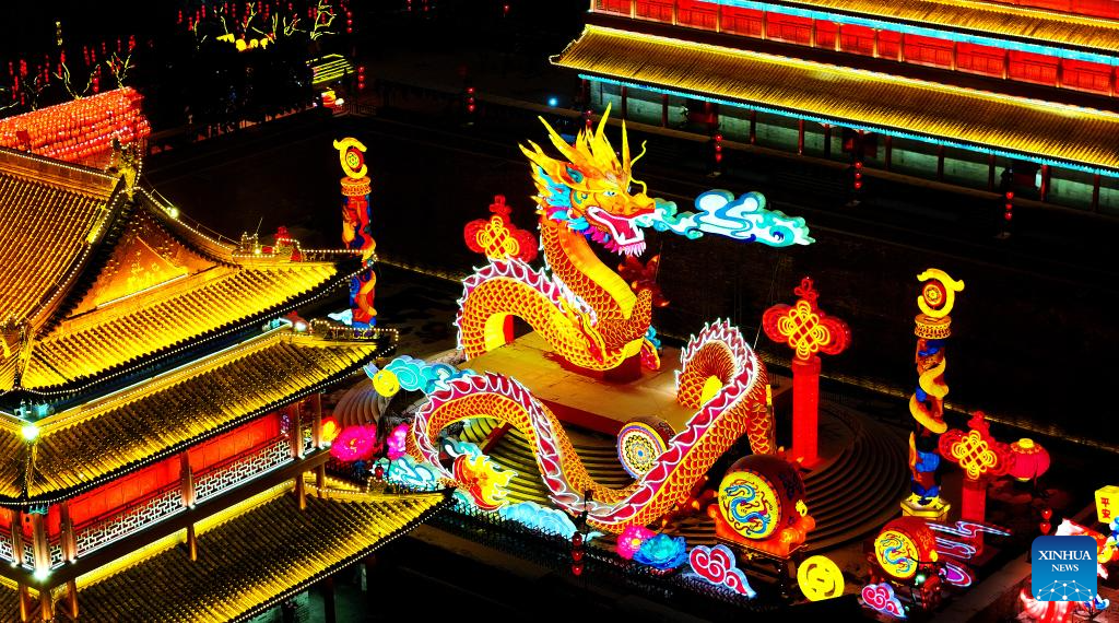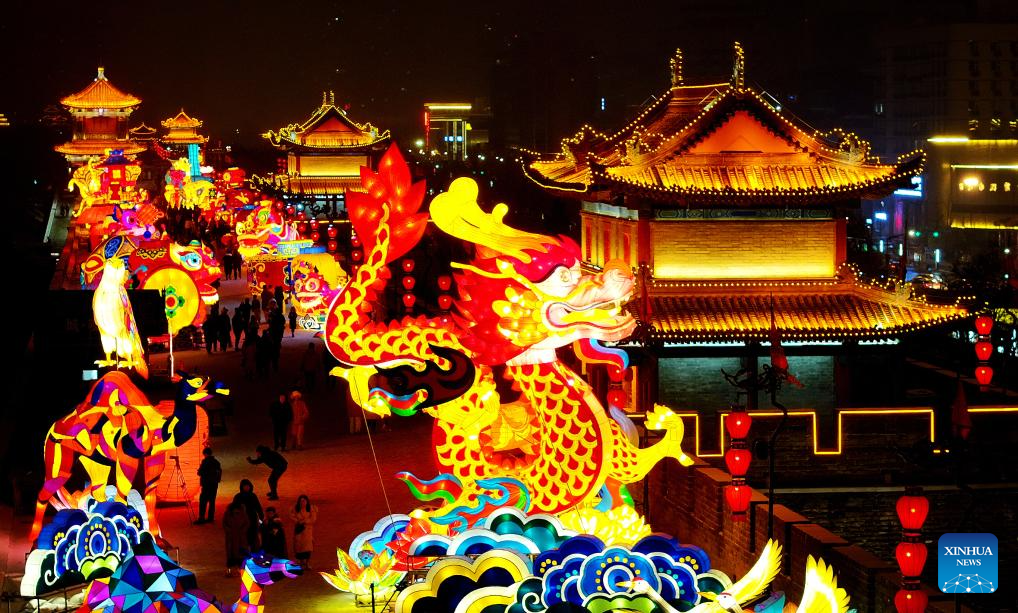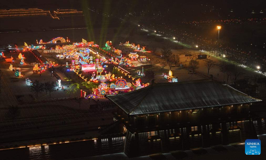 A drone photo taken on Feb. 2, 2024 shows light decorations near the city wall of Xi'an, capital of northwest China's Shaanxi Province. The 2024 Chang'an Light Show started in Xi'an on Friday. Thousands of lights and lanterns decorated many places of interests in the city, including the city wall, the Tang Paradise complex and the Daming Palace National Heritage Park. (Xinhua/Liu Xiao)