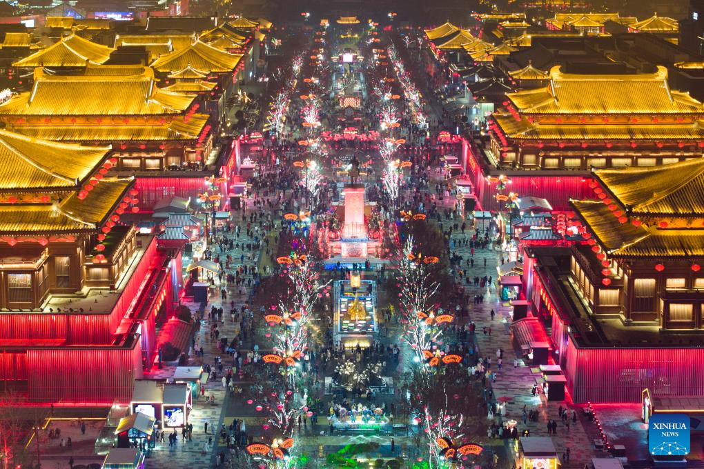 An aerial drone photo taken on Feb. 2, 2024 shows a view of the Great Tang All Day Mall in Xi'an, capital of northwest China's Shaanxi Province. The 2024 Chang'an Light Show started in Xi'an on Friday. Thousands of lights and lanterns decorated many places of interests in the city, including the city wall, the Tang Paradise complex and the Daming Palace National Heritage Park. (Xinhua/Shao Rui)