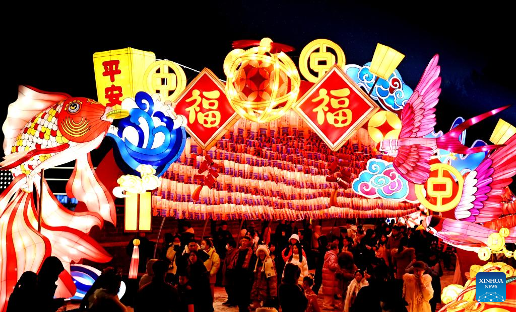 Light decorations are seen at the Daming Palace National Heritage Park in Xi'an, capital of northwest China's Shaanxi Province, Feb. 2, 2024. The 2024 Chang'an Light Show started in Xi'an on Friday. Thousands of lights and lanterns decorated many places of interests in the city, including the city wall, the Tang Paradise complex and the Daming Palace National Heritage Park. (Xinhua/Zhang Bowen)