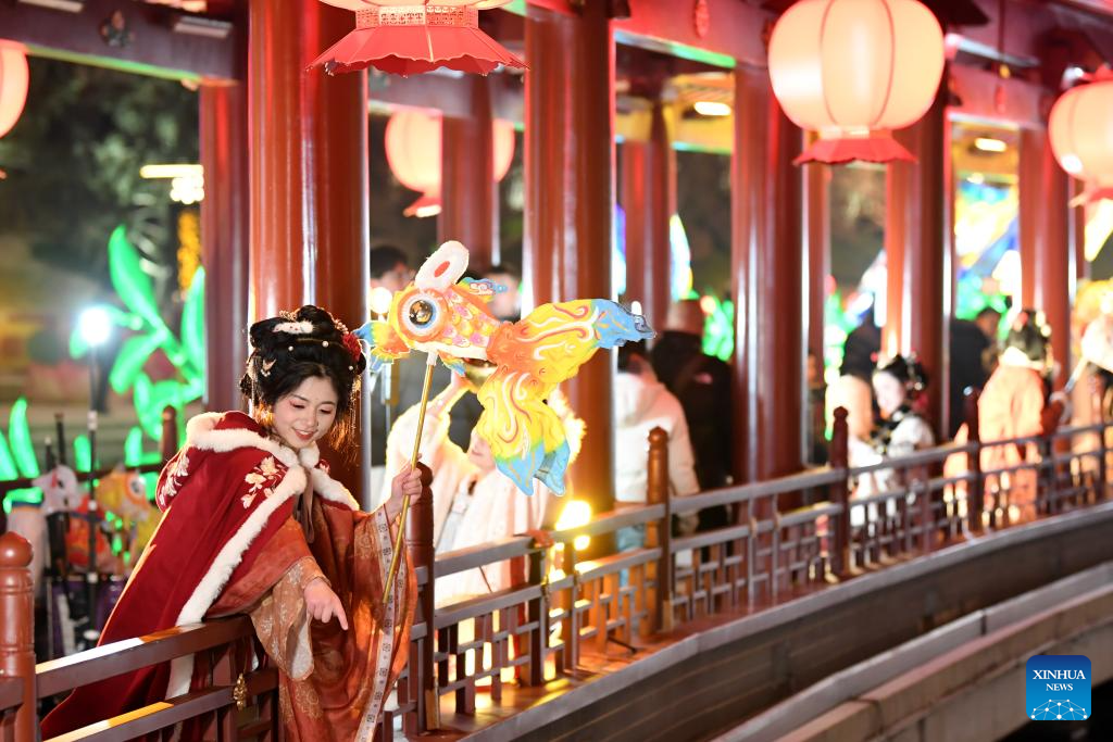 A tourist poses for photos at the Tang Paradise, a complex based on the site of the original relic of an imperial garden dating back to the Tang Dynasty (618-907), in Xi'an, capital of northwest China's Shaanxi Province, Feb. 2, 2024. The 2024 Chang'an Light Show started in Xi'an on Friday. Thousands of lights and lanterns decorated many places of interests in the city, including the city wall, the Tang Paradise complex and the Daming Palace National Heritage Park. (Xinhua/Li Yibo)
