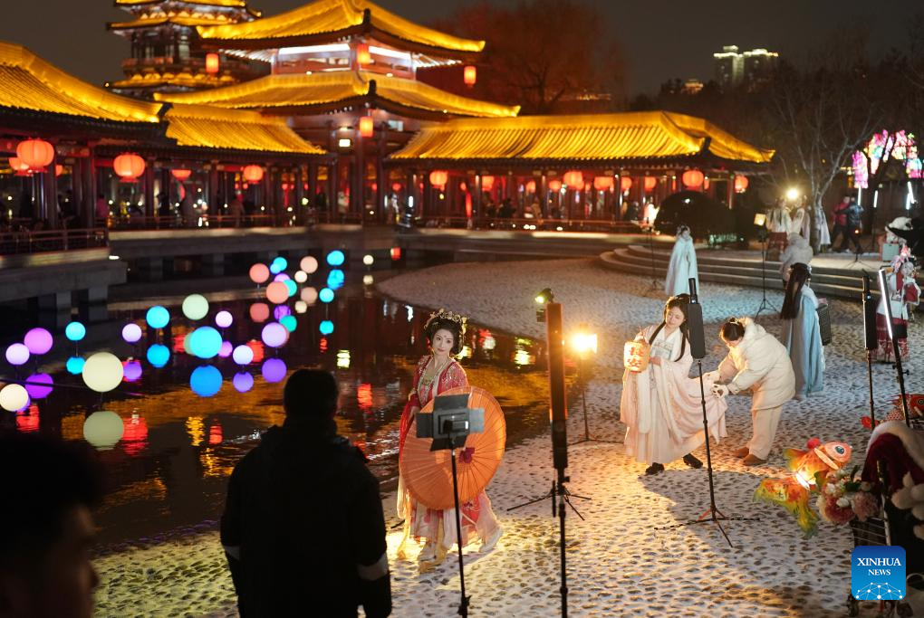 Tourists pose for photos at the Tang Paradise, a complex based on the site of the original relic of an imperial garden dating back to the Tang Dynasty (618-907), in Xi'an, capital of northwest China's Shaanxi Province, Feb. 2, 2024. The 2024 Chang'an Light Show started in Xi'an on Friday. Thousands of lights and lanterns decorated many places of interests in the city, including the city wall, the Tang Paradise complex and the Daming Palace National Heritage Park. (Xinhua/Shao Rui)