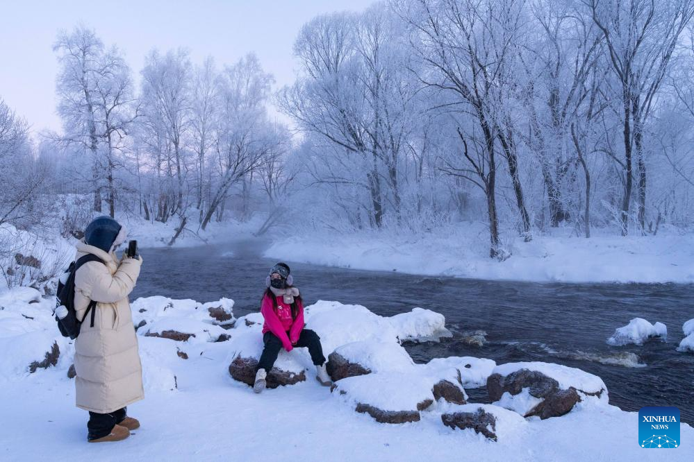 Tourists enjoy the rime scenery along the Kurbin River near Pingtai Village in Xunke County of Heihe, northeast China's Heilongjiang Province, Feb. 2, 2024. (Xinhua/Xie Jianfei)