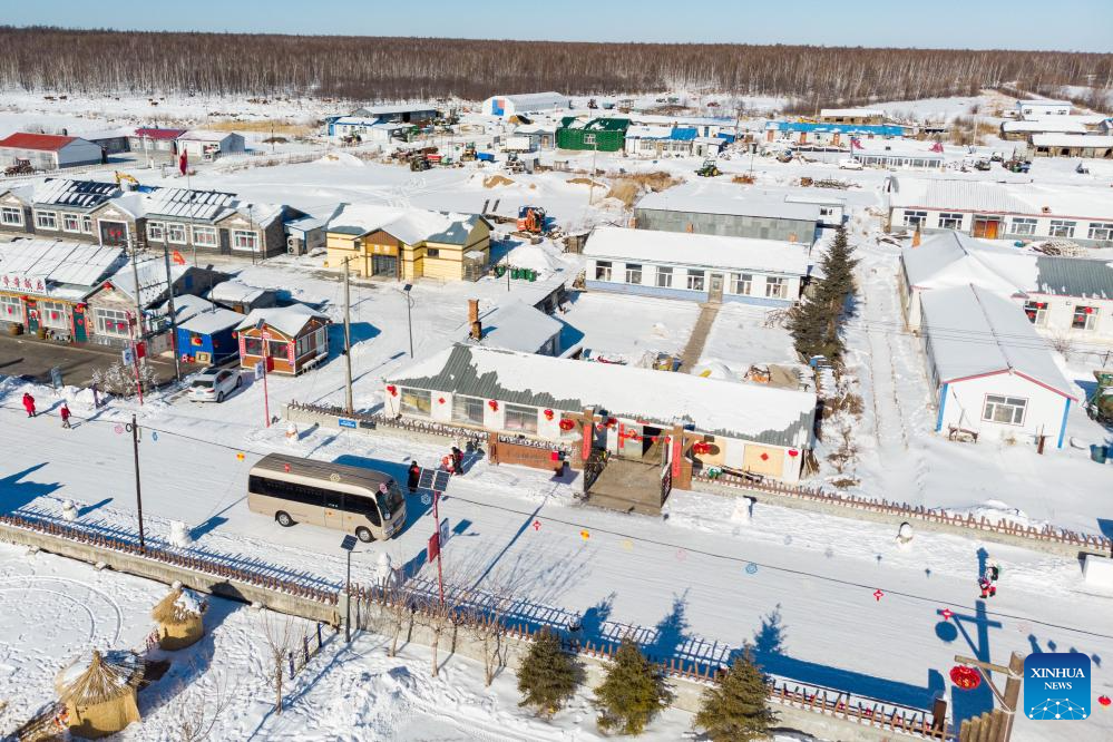An aerial drone photo taken on Feb. 2, 2024 shows a tourist center of Pingtai Village in Xunke County of Heihe, northeast China's Heilongjiang Province. (Xinhua/Xie Jianfei)