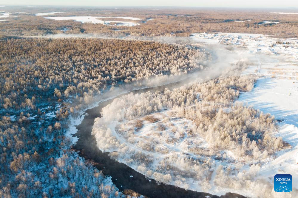 An aerial drone photo taken on Feb. 2, 2024 shows the rime scenery along the Kurbin River near Pingtai Village in Xunke County of Heihe, northeast China's Heilongjiang Province. (Xinhua/Xie Jianfei)