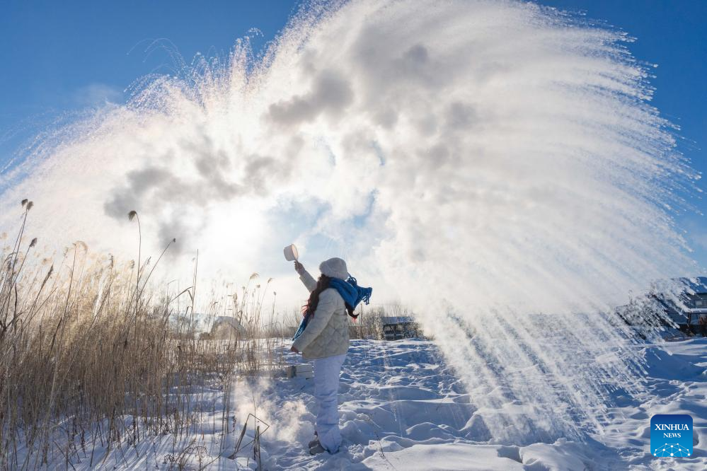A tourist pours water in the air at Pingtai Village in Xunke County of Heihe, northeast China's Heilongjiang Province, Feb. 2, 2024. (Xinhua/Xie Jianfei)