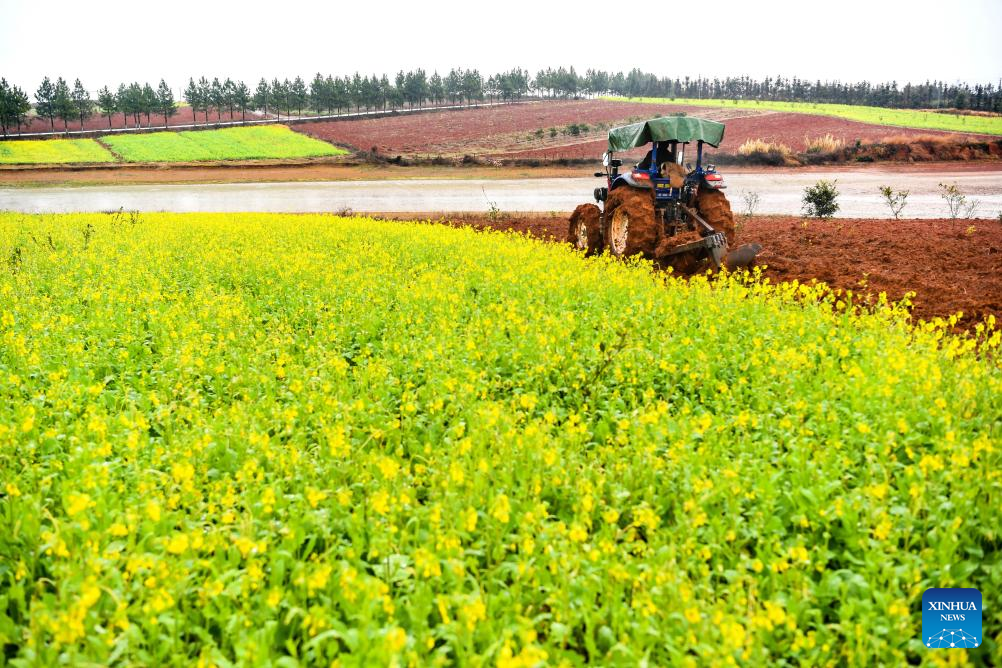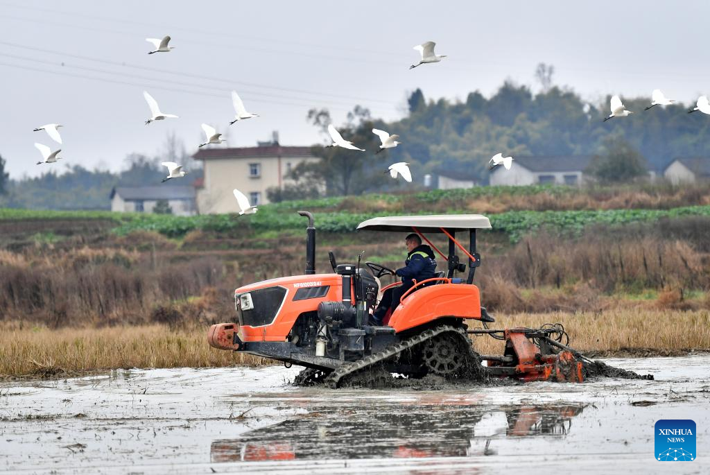 A villager ploughs the field in Yicheng Town of Zhangshu City, east China's Jiangxi Province, Feb. 4, 2024. Sunday marks "Lichun", meaning the beginning of spring, the first solar term in the traditional Chinese lunar calendar. (Photo by Zhou Liang/Xinhua)