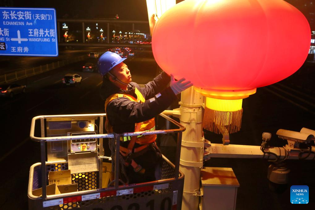 A worker adjusts a red lantern on Chang'an Avenue in Beijing, capital of China, Feb. 1, 2024. (Photo by Zhang Chao/Xinhua)