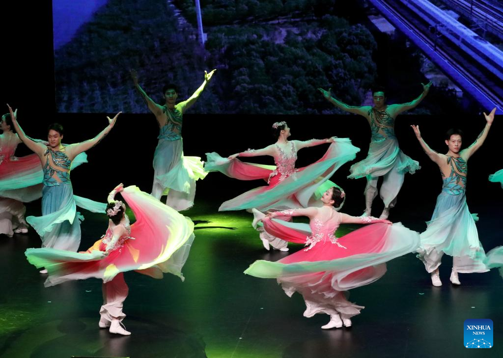 Actors perform a dance during the "Festival of Spring" Chinese Lunar New Year Gala Night in Wellington, New Zealand, Feb. 15, 2024. The "Festival of Spring" is a national cultural brand hosted by the Overseas Chinese Affairs Office of China's State Council, and the All-China Federation of Returned Overseas Chinese, a Chinese civic organization. (Photo by Meng Tao/Xinhua)