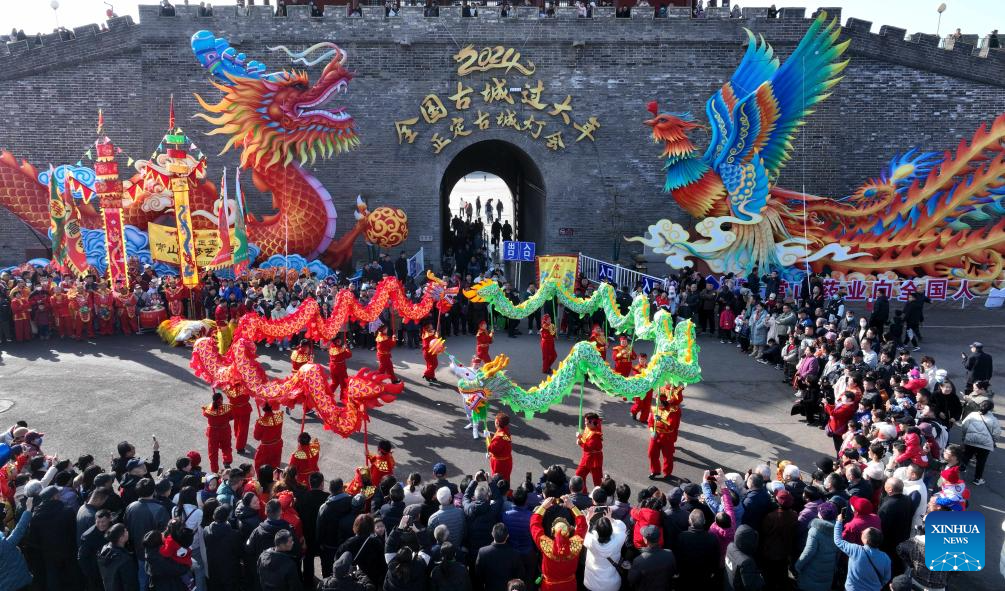 Tourists watch a dragon dance performance at the Zhengding ancient city in Shijiazhuang, north China's Hebei Province, Feb. 15, 2024. More Chinese people nowadays choose to go on a journey during the Spring Festival to experience different cultures and lunar new year atmosphere. (Photo by Chen Qibao/Xinhua)