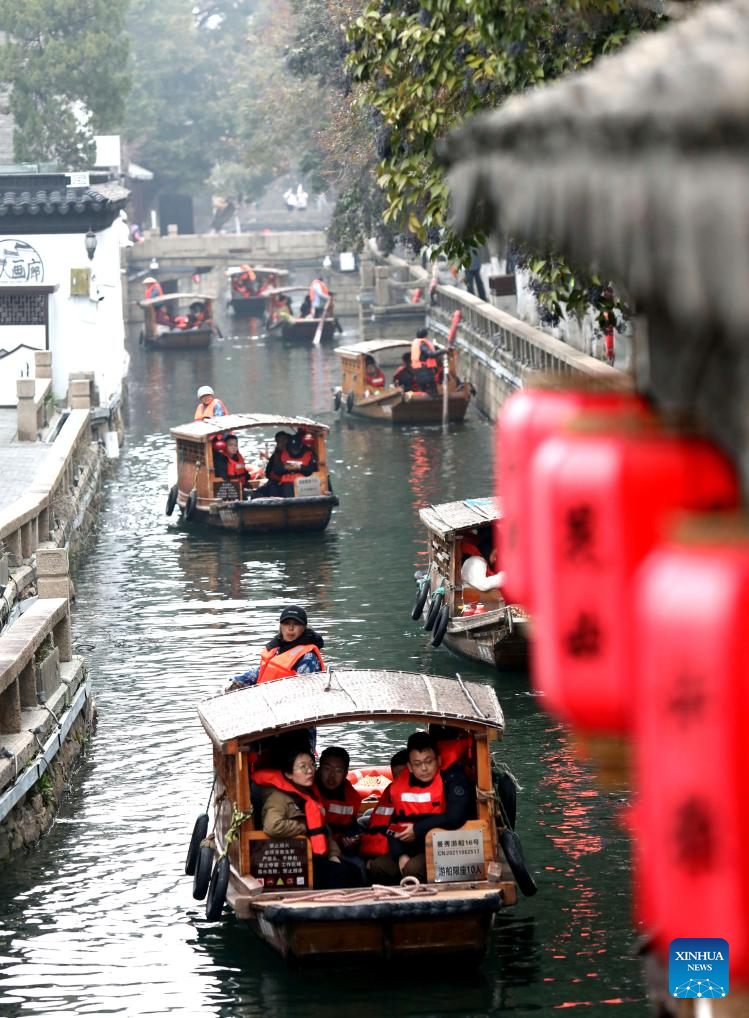 Tourists visit the Pingjiang Road by boat in Suzhou, east China's Jiangsu Province, Feb. 15, 2024. More Chinese people nowadays choose to go on a journey during the Spring Festival to experience different cultures and lunar new year atmosphere. (Photo by Hang Xingwei/Xinhua)