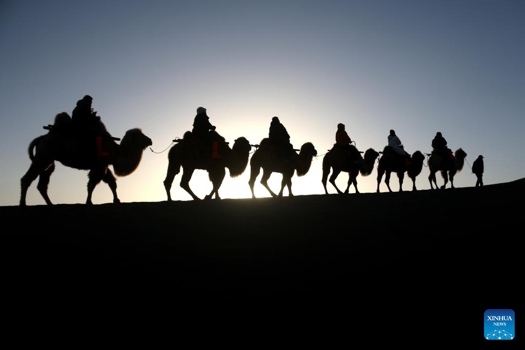 Tourists visit the Mingsha Mountain and Crescent Spring scenic spot in Dunhuang, northwest China's Gansu Province, Feb. 15, 2024. More Chinese people nowadays choose to go on a journey during the Spring Festival to experience different cultures and lunar new year atmosphere. (Photo by Zhang Xiaoliang/Xinhua)