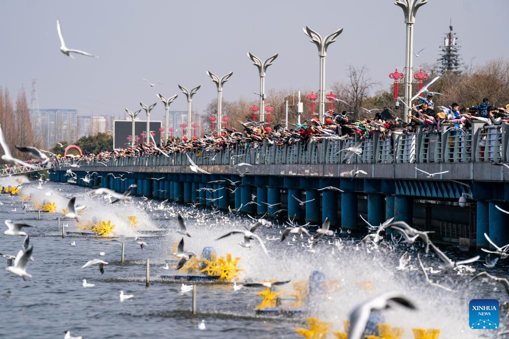 People watch black-headed gulls at a dam in Kunming, southwest China's Yunnan Province, Feb. 15, 2024. More Chinese people nowadays choose to go on a journey during the Spring Festival to experience different cultures and lunar new year atmosphere. (Xinhua/Hu Chao)