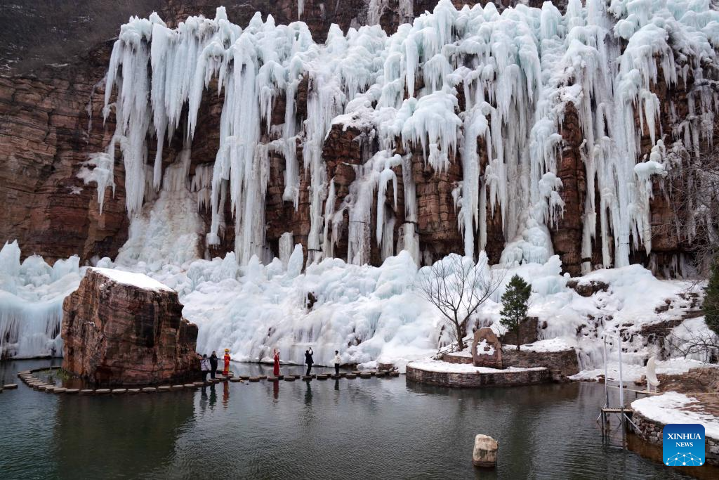 Tourists enjoy the frozen waterfall scenery at the Tianhe Mountain scenic spot in Xingtai, north China's Hebei Province, Feb. 14, 2024. More Chinese people nowadays choose to go on a journey during the Spring Festival to experience different cultures and lunar new year atmosphere. (Photo by Chen Lei/Xinhua)