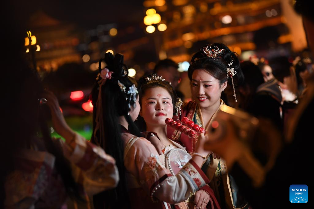 Tourists wearing Hanfu, a style of clothing traditionally worn by the Han people, enjoy themselves at night in Xi'an, northwest China's Shaanxi Province, Feb. 13, 2024. More Chinese people nowadays choose to go on a journey during the Spring Festival to experience different cultures and lunar new year atmosphere. (Xinhua/Li Yibo)