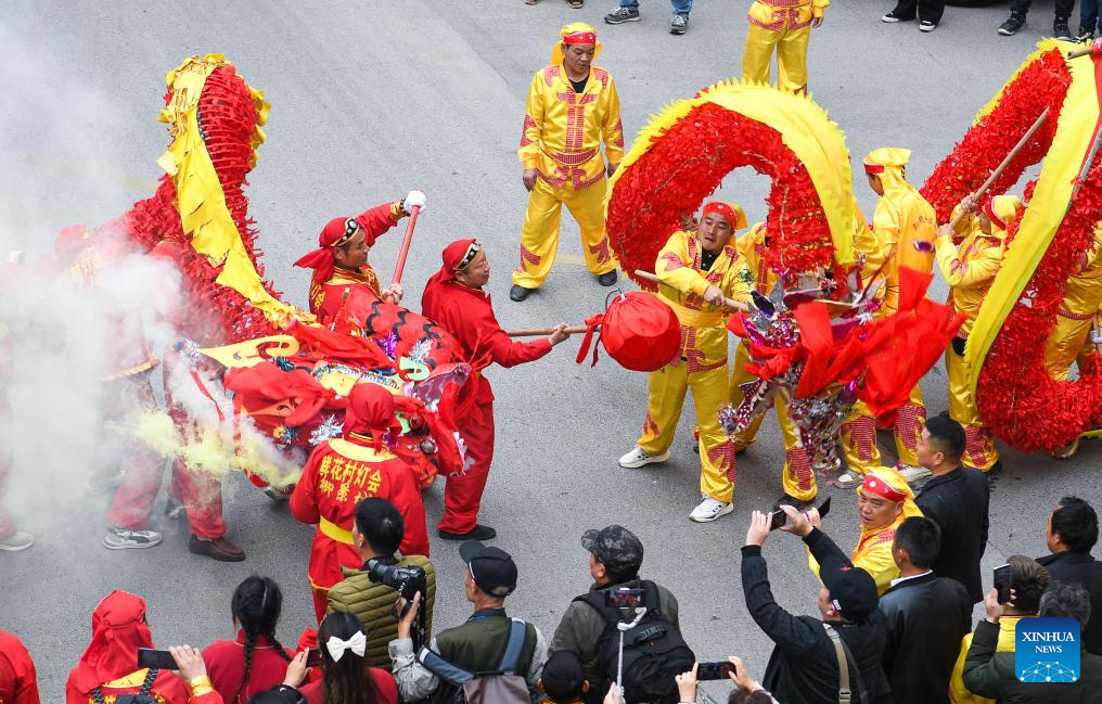Local people perform dragon dance during the "Maolong Festival" of Gelao ethnic group in Shiqian County, southwest China's Guizhou Province, Feb. 20, 2024. The festival, as a folk activity for people of the Gelao ethnic group to celebrate the Spring Festival and lantern festival, is listed as one of the national intangible cultural heritages in 2006. (Xinhua/Yang Wenbin)