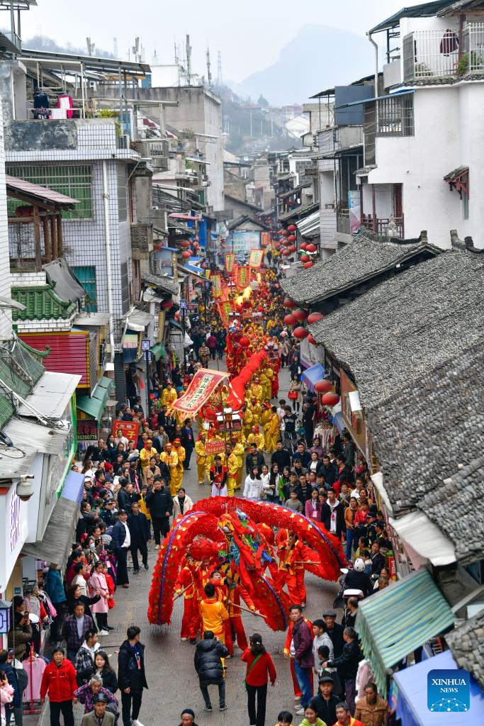 People participate in a dragon dance parade during the "Maolong Festival" of Gelao ethnic group in Shiqian County, southwest China's Guizhou Province, Feb. 20, 2024. The festival, as a folk activity for people of the Gelao ethnic group to celebrate the Spring Festival and lantern festival, is listed as one of the national intangible cultural heritages in 2006. (Xinhua/Yang Wenbin)