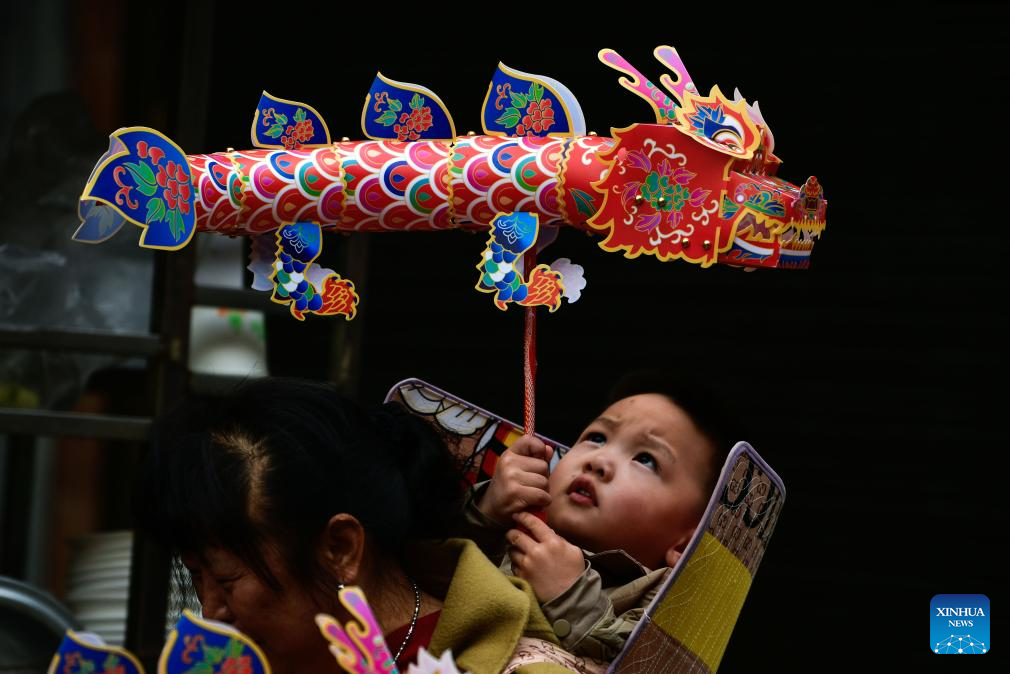 A child holds a dragon toy during a parade of "Maolong Festival" of Gelao ethnic group in Shiqian County, southwest China's Guizhou Province, Feb. 20, 2024. The festival, as a folk activity for people of the Gelao ethnic group to celebrate the Spring Festival and lantern festival, is listed as one of the national intangible cultural heritages in 2006. (Xinhua/Yang Wenbin)