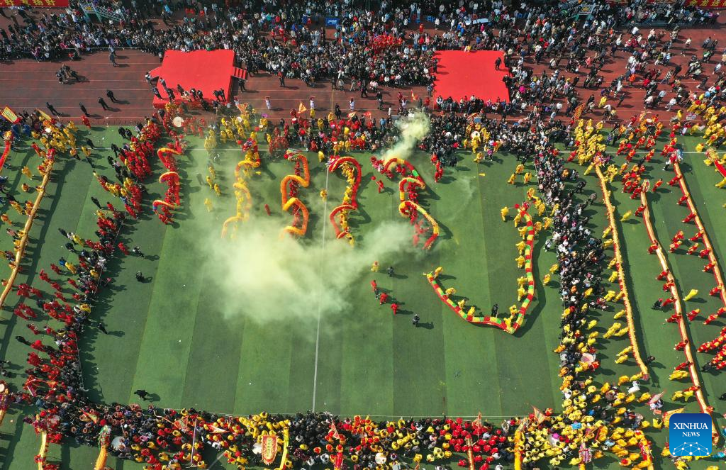 An aerial drone photo shows people watching dragon dance performance during the "Maolong Festival" of Gelao ethnic group in Shiqian County, southwest China's Guizhou Province, Feb. 20, 2024. The festival, as a folk activity for people of the Gelao ethnic group to celebrate the Spring Festival and lantern festival, is listed as one of the national intangible cultural heritages in 2006. (Xinhua/Yang Wenbin)