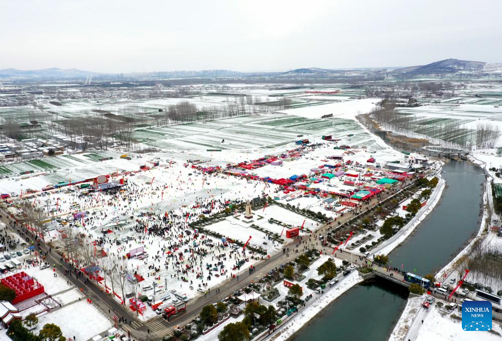 An aerial drone photo taken on Feb. 22, 2024 shows a view of the Quyi fair in Majie Village of Baofeng County, central China's Henan Province. (Xinhua/Hao Yuan)
