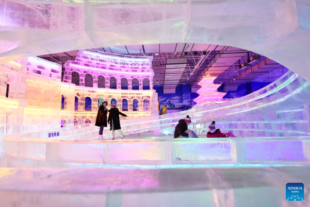 Tourists have fun at an ice and snow art gallery of the Sun Island scenic spot in Harbin, northeast China's Heilongjiang Province, Feb. 23, 2024. Covering an area of nearly 5,000 square meters, this indoor ice and snow art gallery wowed tourists with ice sculptures and various ice and snow entertainment. (Xinhua/Wang Jianwei)