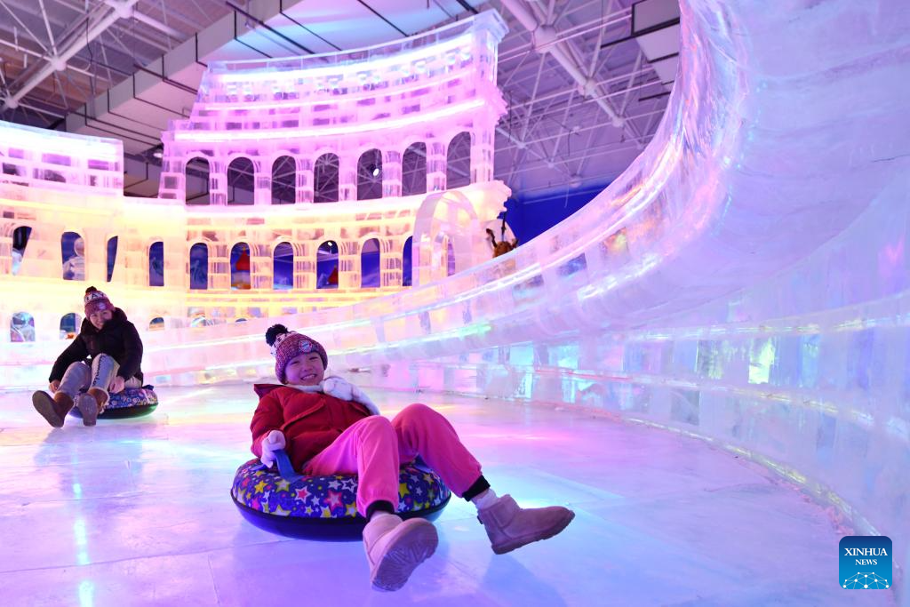 A kid enjoys an ice slide at an ice and snow art gallery of the Sun Island scenic spot in Harbin, northeast China's Heilongjiang Province, Feb. 23, 2024. Covering an area of nearly 5,000 square meters, this indoor ice and snow art gallery wowed tourists with ice sculptures and various ice and snow entertainment. (Xinhua/Wang Jianwei)