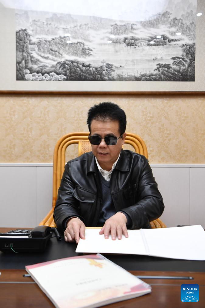 Wang Yongcheng reads the Braille versions of replies to the suggestions he raised at an instruction center of blind massage in Fuzhou, southeast China's Fujian Province, Feb. 6, 2024.(Xinhua/Jiang Kehong)
