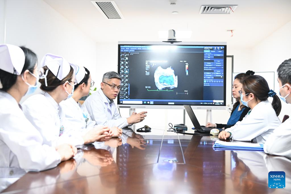 Zhang Junjie (4th L) communicates with colleagues at the Nanjing First Hospital in Nanjing, east China's Jiangsu Province, Feb. 20, 2024. (Xinhua/Ji Chunpeng)