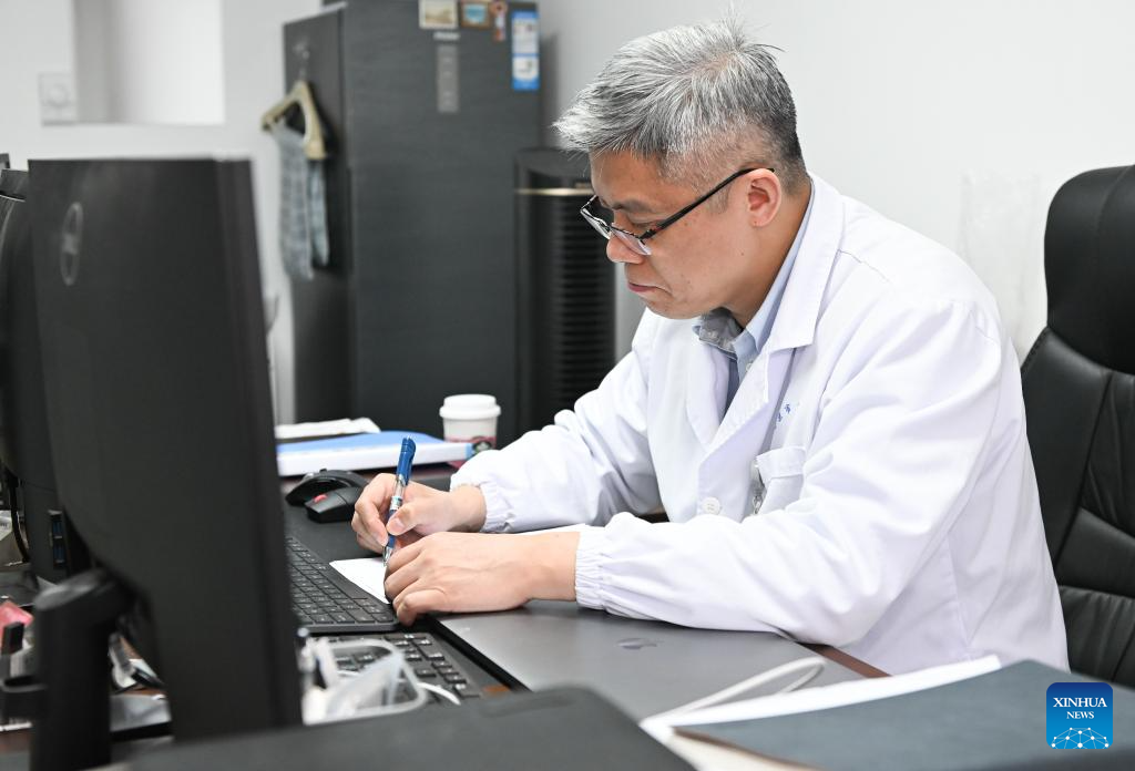 Zhang Junjie (R) communicates with colleagues at the Nanjing First Hospital in Nanjing, east China's Jiangsu Province, Feb. 20, 2024. (Xinhua/Ji Chunpeng)